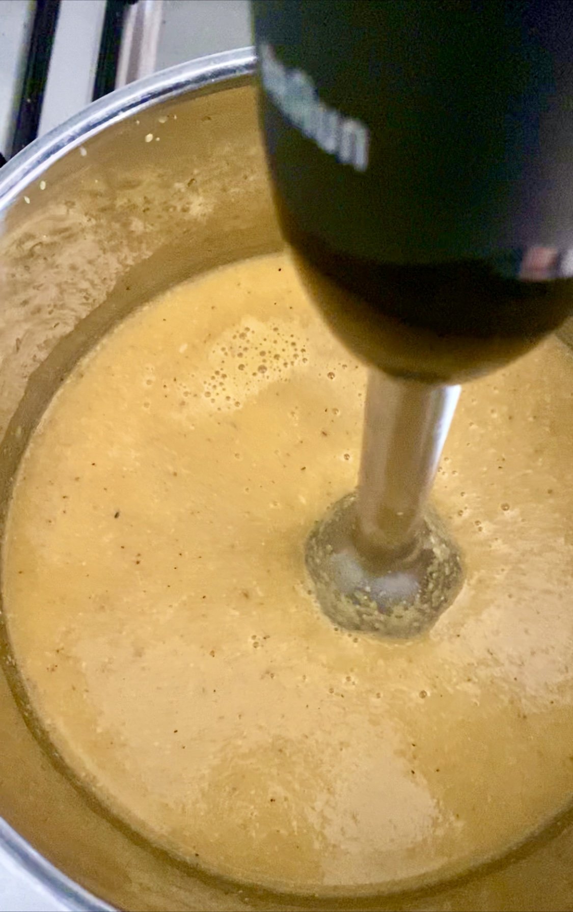 Save a few florets for garnish. Then transfer the remaining cauliflower, onion, and garlic to a pot. Pour the vegetable broth into the same pot. Use a hand blender and blend on high until smooth. If you'd like a thinner consistency, just add more broth or water. I used my Braun MQ505 hand blender and I love it!