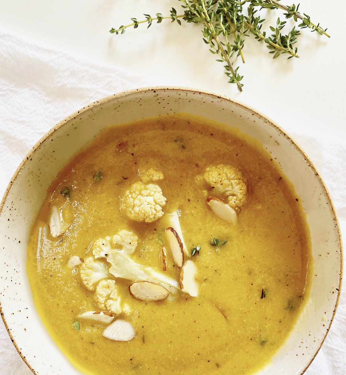To serve, add the roasted cauliflower soup to a bowl and top a couple of roasted cauliflower florets, almond slices, and fresh thyme.