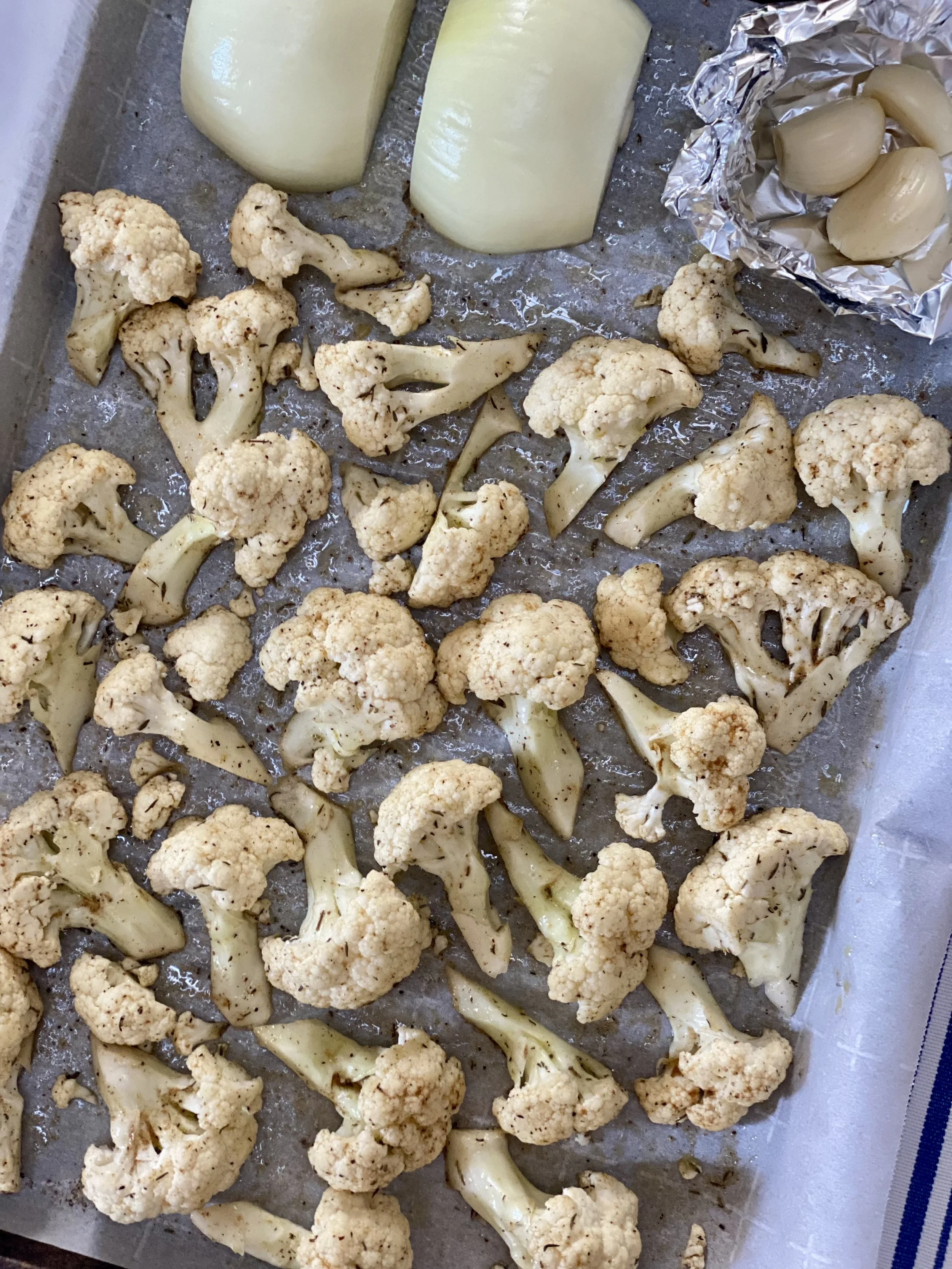 Add the cauliflower florets to a baking sheet covered with parchment paper. Drizzle with olive oil and add the cumin, coriander, dried thyme, salt, and pepper.